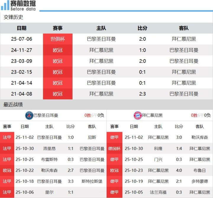 第一:两队情况!欧冠联赛阶段前3轮战罢,巴黎和拜仁都是豪取三连胜积9分,两队排名前二,因此这是一场欧冠榜首大战。上场联赛,巴黎主场1-0小胜尼斯,各项赛事近8场5胜3平保持不败;拜仁主场3-0大胜勒沃库森,孔帕尼进行了大轮换,本赛季至今豪取各项赛事15场全胜开局!巴黎全队总身价11.5亿欧元;拜仁全队总身价9.52亿欧元。